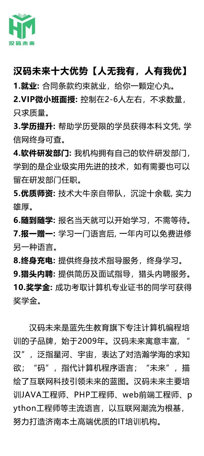 汉码未来2014年正式运营,是全国连锁机构,济南+杭州双总校,国内高端IT培训品牌。汉码未来的办公场地、车位等都是由机构自购自用,位于国企园区,还为学员提供免费住宿,真正拿真金白银解决学员的刚需。汉码未来是中国职业教育行业的领头羊,早在2014年就活跃在腾讯教育、网易云教育、YY教育、淘宝教育、百度传课等互联网教育平台,与各大高校均有合作。另外,机构拥有自己的研发公司和"非摆设"实验室,真正让学员掌握一技之长。汉码未来专注计算机编程软硬件领域,5人精品班+全程面授的形式颇受喜爱(在校大学生可采用线上+线下结合模式),是咱国人自己的本土优质老品牌!值得信赖!