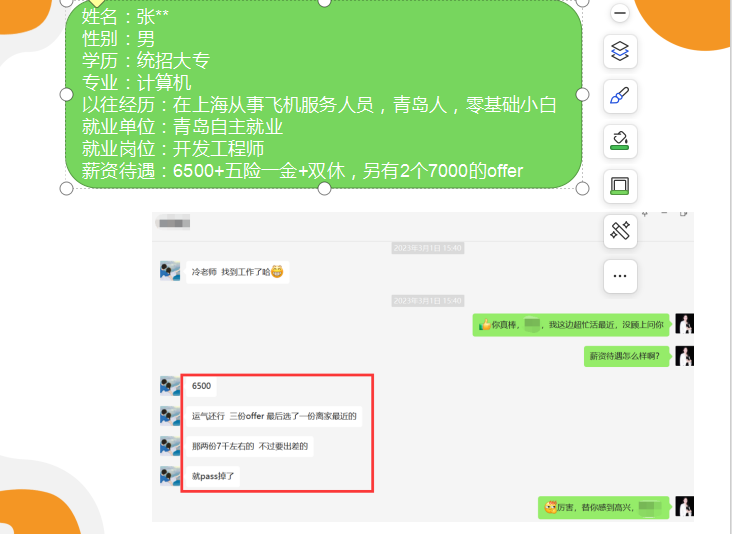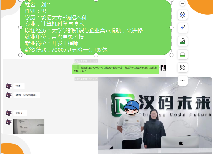 这是汉码未来机构今年毕业的部分毕业生,类似这样的学生还有很多很多,就不和大家一一列举了,他们有的是学java全栈、有的学是web前端(含鸿蒙)、有的学是物联网嵌入式,都找到了对口的,不错的工作。